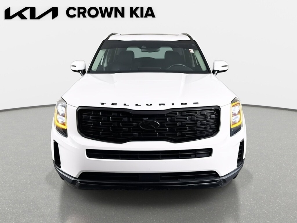 This 2021 Kia Telluride EX in Glacial White Pearl features: 2nd Row Captain Chairs, 3.648 Axle Ratio, 3rd row seats: split-bench, 4-Wheel Disc Brakes, 6 Speakers, ABS brakes, Air Conditioning, Alloy wheels, AM/FM radio: SiriusXM, Apple CarPlay & Android Auto, Auto-dimming Rear-View mirror, Automatic temperature control, Black Finish Radiator Grille, Brake assist, Bumpers: body-color, Carpeted Floor Mats, Compass, Delay-off headlights, Driver door bin, Driver vanity mirror, Dual front impact airbags, Dual front side impact airbags, Electronic Stability Control, Emergency communication system: 911 Connect, EX Premium Package, Exclusive Black Headlight Bezels, Four wheel independent suspension, Front & Rear Gloss Black Finish Bumper Skid Plates, Front & Rear KIA Logo, Front anti-roll bar, Front Bucket Seats, Front Center Armrest, Front dual zone A/C, Front reading lights, Fully automatic headlights, Gloss Black Finish Exterior Emblems, Gloss Black Finish Front & Rear Door Garnish, Gloss Black Finish Roof Rails, Heated & Ventilated Front Bucket Seats, Heated door mirrors, Heated front seats, Heated steering wheel, Illuminated entry, Knee airbag, Leather Seat Trim, Leather Shift Knob, Leather steering wheel, LED Headlamps, Low tire pressure warning, Navigation System, Nightfall Edition Package, Occupant sensing airbag, Outside temperature display, Overhead airbag, Overhead console, Panic alarm, Passenger door bin, Passenger vanity mirror, Power door mirrors, Power driver seat, Power Liftgate, Power moonroof, Power passenger seat, Power steering, Power windows, Radio data system, Radio: AM/FM/SIRIUS Display Audio, Rear air conditioning, Rear anti-roll bar, Rear audio controls, Rear reading lights, Rear seat center armrest, Rear window defroster, Rear window wiper, Reclining 3rd row seat, Remote keyless entry, Roof rack: rails only, Satin Chrome Roof Rails, Security system, Smart Key w/ Push Button and Remote Start, Speed control, Speed-sensing steering, Split folding rear seat, Spoiler, Steering wheel mounted audio controls, Tachometer, Telescoping steering wheel, Tilt steering wheel, Traction control, Trip computer, Turn signal indicator mirrors, Variably intermittent wipers, Ventilated front seats, Wheels: 7.5" x 18" Machined Finish Alloy, Wheels: 7.5" x 20" Exclusive Black Finish Alloy, Wheels: 7.5" x 20" Machined Finish Alloy. Clean CARFAX.