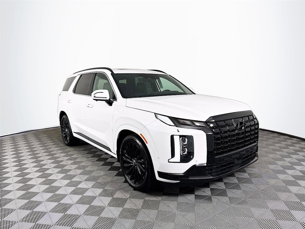 2025 Hyundai Palisade Calligraphy Night Edition Calligraphy Night Edition 12 Speakers, 3rd row seats: split-bench, 4-Wheel Disc Brakes, ABS brakes, Air Conditioning, All-Season Fitted Liners, Alloy wheels, AM/FM radio: SiriusXM, Apple CarPlay & Android Auto, Auto High-beam Headlights, Auto-dimming door mirrors, Auto-dimming Rear-View mirror, Auto-leveling suspension, Automatic temperature control, Brake assist, Bumpers: body-color, Cargo Blocks, Cargo Cover, Cargo Net, Cargo Tray, Compass, Delay-off headlights, Driver door bin, Driver vanity mirror, Dual front impact airbags, Dual front side impact airbags, Electronic Stability Control, Emergency communication system, Exterior Parking Camera Rear, First Aid Kit, Four wheel independent suspension, Front anti-roll bar, Front Bucket Seats, Front Center Armrest, Front dual zone A/C, Front reading lights, Fully automatic headlights, Garage door transmitter: HomeLink, harman/kardon® Speakers, Heads-Up Display, Heated & Ventilated Front Bucket Seats, Heated door mirrors, Heated front seats, Heated rear seats, Heated steering wheel, Illuminated entry, Knee airbag, Leather steering wheel, Low tire pressure warning, Memory seat, Microfiber Suede Seat Trim, Mudguards, Navigation System, Occupant sensing airbag, Option Group 01, Outside temperature display, Overhead airbag, Overhead console, Panic alarm, Passenger door bin, Passenger vanity mirror, Power door mirrors, Power driver seat, Power Liftgate, Power moonroof, Power passenger seat, Power steering, Power windows, Radio data system, Radio: AM/FM/MP3 Premium Audio System, Rain sensing wipers, Rear air conditioning, Rear anti-roll bar, Rear audio controls, Rear Bumper Applique, Rear reading lights, Rear side impact airbag, Rear window defroster, Rear window wiper, Reclining 3rd row seat, Remote keyless entry, Roof rack, Security system, Speed control, Speed-sensing steering, Split folding rear seat, Spoiler, Steering wheel mounted audio controls, Tachometer, Telescoping steering wheel, Tilt steering wheel, Traction control, Trip computer, Turn signal indicator mirrors, Variably intermittent wipers, Ventilated front seats, Ventilated rear seats, Wheel Locks, Wheels: 20" x 7.5J Black Liquid Paint Alloy.