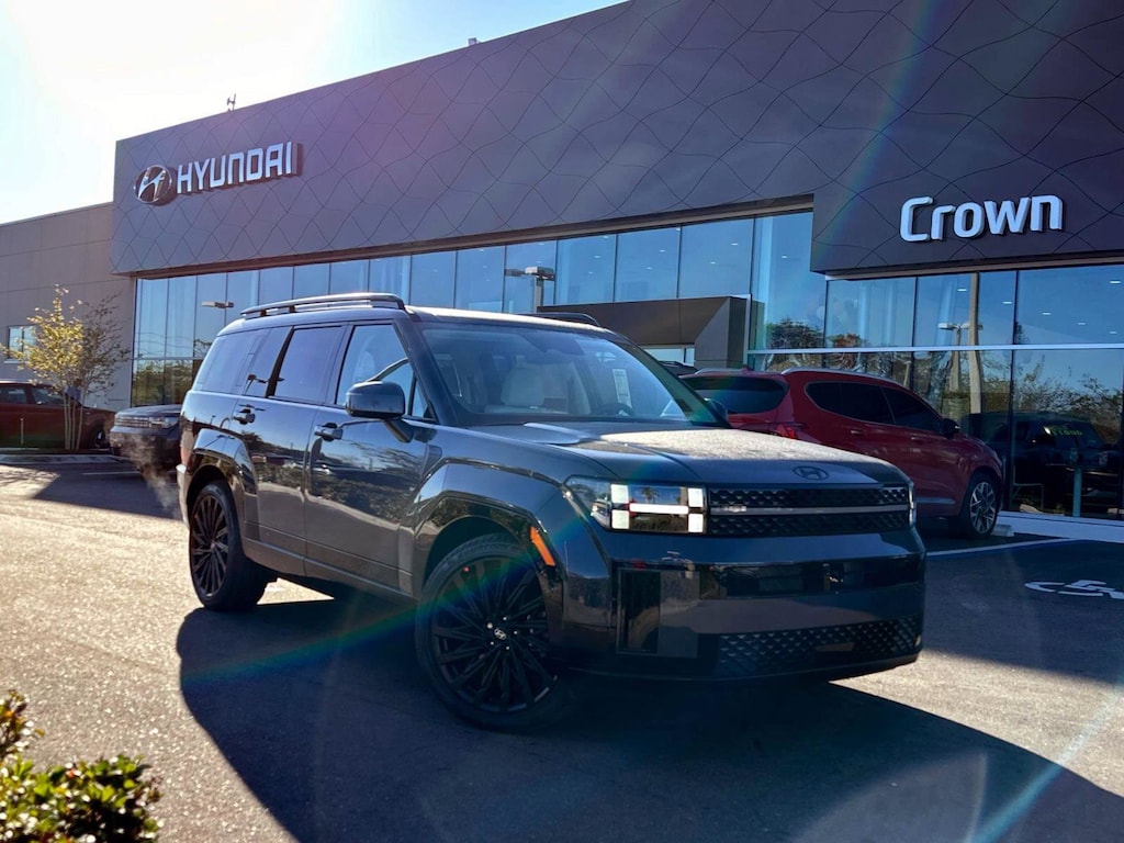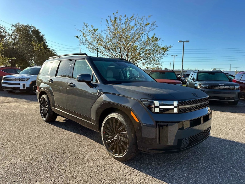 2025 Hyundai Santa Fe Calligraphy Calligraphy Forest Green/Beige Leather, 12 Speakers, 3rd row seats: bench, 4-Wheel Disc Brakes, ABS brakes, Air Conditioning, Alloy wheels, AM/FM radio: SiriusXM, Apple CarPlay & Android Auto, Auto High-beam Headlights, Auto-dimming Rear-View mirror, Automatic temperature control, Brake assist, Bumpers: body-color, Cargo Blocks, Cargo Cover, Carpeted Floor Mats, Delay-off headlights, Driver door bin, Driver vanity mirror, Dual front impact airbags, Dual front side impact airbags, Electronic Stability Control, Emergency communication system, Exterior Parking Camera Rear, First Aid Kit, Four wheel independent suspension, Front anti-roll bar, Front Bucket Seats, Front Center Armrest, Front dual zone A/C, Front reading lights, Fully automatic headlights, Garage door transmitter: HomeLink, Heads-Up Display, Heated & Ventilated Front Bucket Seats, Heated door mirrors, Heated front seats, Heated rear seats, Heated steering wheel, Illuminated entry, Knee airbag, Leather steering wheel, Low tire pressure warning, Memory seat, Navigation System, Occupant sensing airbag, Option Group 01, Outside temperature display, Overhead airbag, Overhead console, Panic alarm, Passenger door bin, Passenger vanity mirror, Power door mirrors, Power driver seat, Power Liftgate, Power moonroof, Power passenger seat, Power steering, Power windows, Premium Nappa Leather Seat Trim, Radio: AM/FM/HD Bose Premium Audio System, Rain sensing wipers, Rear anti-roll bar, Rear side impact airbag, Rear window defroster, Rear window wiper, Remote keyless entry, Security system, Speed control, Speed-sensing steering, Split folding rear seat, Spoiler, Steering wheel mounted audio controls, Tachometer, Telescoping steering wheel, Tilt steering wheel, Traction control, Trip computer, Turn signal indicator mirrors, Variably intermittent wipers, Ventilated front seats, Wheels: 21" x 8.5J Unique Dark Finish Alloy, Forest Green/Beige Leather. 20/29 City/Highway MPG