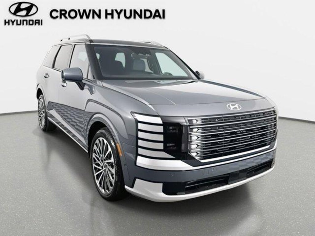 2026 Hyundai Palisade Calligraphy Calligraphy 14 Speakers, 3rd row seats: split-bench, 4-Wheel Disc Brakes, ABS brakes, Air Conditioning, Alloy wheels, AM/FM radio: SiriusXM, Apple CarPlay & Android Auto, Audio memory, Auto High-beam Headlights, Auto-dimming door mirrors, Auto-dimming Rear-View mirror, Auto-leveling suspension, Automatic temperature control, Brake assist, Bumpers: body-color, Cargo Net, Cargo Tray, Carpeted Floor Mats, Compass, Delay-off headlights, Driver door bin, Driver vanity mirror, Dual front impact airbags, Dual front side impact airbags, Electronic Stability Control, Emergency communication system: Bluelink+, Exterior Parking Camera Rear, First Aid Kit, Four wheel independent suspension, Front anti-roll bar, Front Bucket Seats, Front Center Armrest, Front dual zone A/C, Front reading lights, Fully automatic headlights, Garage door transmitter: HomeLink, Genuine wood console insert, Genuine wood dashboard insert, Heads-Up Display, Heated & Ventilated Front Bucket Seats, Heated door mirrors, Heated front seats, Heated rear seats, Heated steering wheel, HVAC memory, Illuminated entry, Knee airbag, Leather steering wheel, Low tire pressure warning, Memory seat, Mud Guards, Navigation System, Occupant sensing airbag, Option Group 01, Outside temperature display, Overhead airbag, Overhead console, Panic alarm, Passenger door bin, Passenger vanity mirror, Power door mirrors, Power driver seat, Power Liftgate, Power moonroof, Power passenger seat, Power steering, Power windows, Premium Nappa Leather Seat Trim, Radio data system, Radio: Infotainment Navigation System, Rain sensing wipers, Rear air conditioning, Rear anti-roll bar, Rear audio controls, Rear reading lights, Rear side impact airbag, Rear window defroster, Rear window wiper, Reclining 3rd row seat, Remote keyless entry, Security system, Speed control, Split folding rear seat, Spoiler, Steering wheel mounted audio controls, Tachometer, Telescoping steering wheel, Tilt steering wheel, Traction control, Trip computer, Turn signal indicator mirrors, Variably intermittent wipers, Ventilated front seats, Ventilated rear seats, Wheels: 21" x 8.5J Alloy.