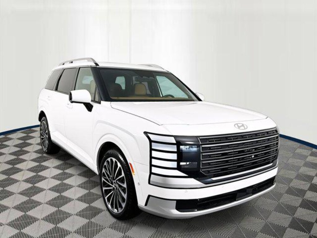 2026 Hyundai Palisade Calligraphy Calligraphy 14 Speakers, 3rd row seats: split-bench, 4-Wheel Disc Brakes, ABS brakes, Air Conditioning, Alloy wheels, AM/FM radio: SiriusXM, Apple CarPlay & Android Auto, Audio memory, Auto High-beam Headlights, Auto-dimming door mirrors, Auto-dimming Rear-View mirror, Auto-leveling suspension, Automatic temperature control, Brake assist, Bumpers: body-color, Cargo Blocks, Cargo Net, Carpeted Floor Mats, Compass, Delay-off headlights, Driver door bin, Driver vanity mirror, Dual front impact airbags, Dual front side impact airbags, Electronic Stability Control, Emergency communication system: Bluelink+, Exterior Parking Camera Rear, First Aid Kit, Four wheel independent suspension, Front anti-roll bar, Front Bucket Seats, Front Center Armrest, Front dual zone A/C, Front reading lights, Fully automatic headlights, Garage door transmitter: HomeLink, Genuine wood console insert, Genuine wood dashboard insert, Heads-Up Display, Heated & Ventilated Front Bucket Seats, Heated door mirrors, Heated front seats, Heated rear seats, Heated steering wheel, HVAC memory, Illuminated entry, Knee airbag, Leather steering wheel, Low tire pressure warning, Memory seat, Navigation System, Occupant sensing airbag, Option Group 01, Outside temperature display, Overhead airbag, Overhead console, Panic alarm, Passenger door bin, Passenger vanity mirror, Power door mirrors, Power driver seat, Power Liftgate, Power moonroof, Power passenger seat, Power steering, Power windows, Premium Nappa Leather Seat Trim, Radio data system, Radio: Infotainment Navigation System, Rain sensing wipers, Rear air conditioning, Rear anti-roll bar, Rear audio controls, Rear reading lights, Rear side impact airbag, Rear window defroster, Rear window wiper, Reclining 3rd row seat, Remote keyless entry, Security system, Severe Weather Kit, Speed control, Split folding rear seat, Spoiler, Steering wheel mounted audio controls, Tachometer, Telescoping steering wheel, Tilt steering wheel, Traction control, Trip computer, Turn signal indicator mirrors, Variably intermittent wipers, Ventilated front seats, Ventilated rear seats, Wheels: 21" x 8.5J Alloy.