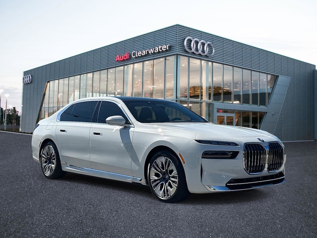 Experience the future of executive travel in this Alpine White BMW i7 xDrive60, blending cutting-edge electric performance with uncompromising luxury. The Tartufo Extended Merino Leather interior sets a warm, refined tone, complemented by the Executive Package with automatic doors, crystal headlights, and the stunning Panoramic Sky Lounge LED Roof.